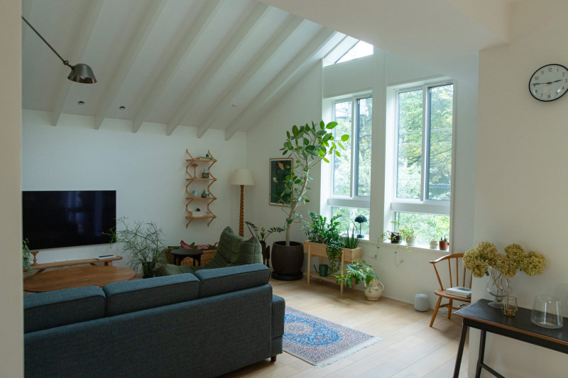 勾配屋根のリビング。白い背景が窓からの緑や家具たちを引き立てます。