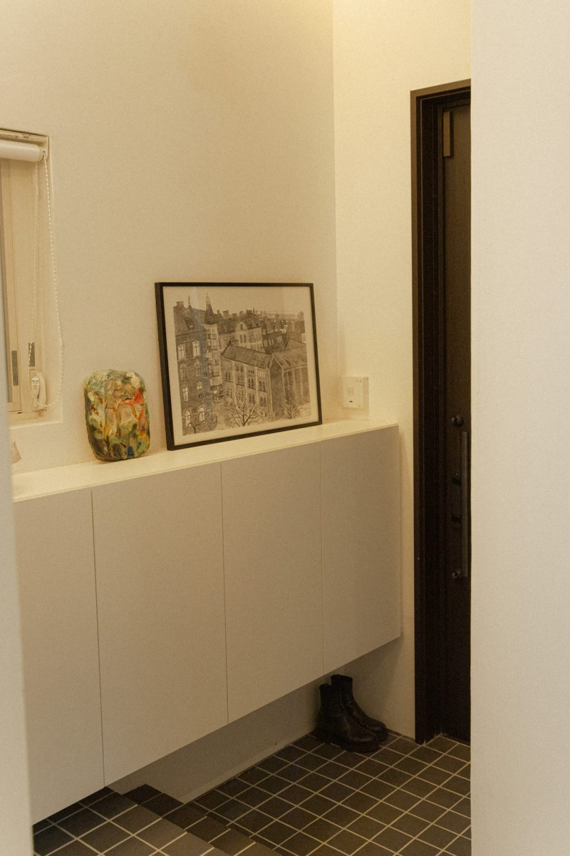 玄関の造作棚は、通路幅を広くとることを優先して通常より薄くした。中の靴は斜め置き。