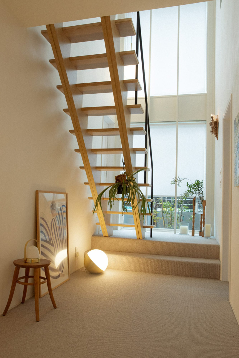 玄関ホールは、ふかふかしたウールカーペットを敷き詰めて。時には、ストレッチや瞑想をするスペースにも。
