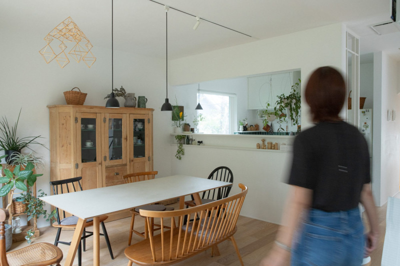 愛用の北欧家具が引き立つよう、壁は白ですっきりまとめて。食器棚は、棚板だけグリーンに塗り直した。