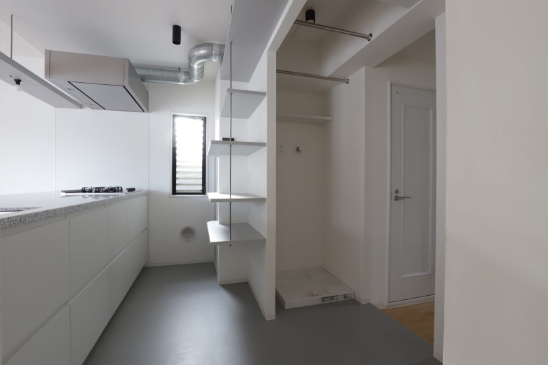 洗濯置場はキッチンの背面、冷蔵庫の並びに。キッチンの背面からそのまま廊下とつながる引戸を新設したので、浴室とのアクセスも良好です。