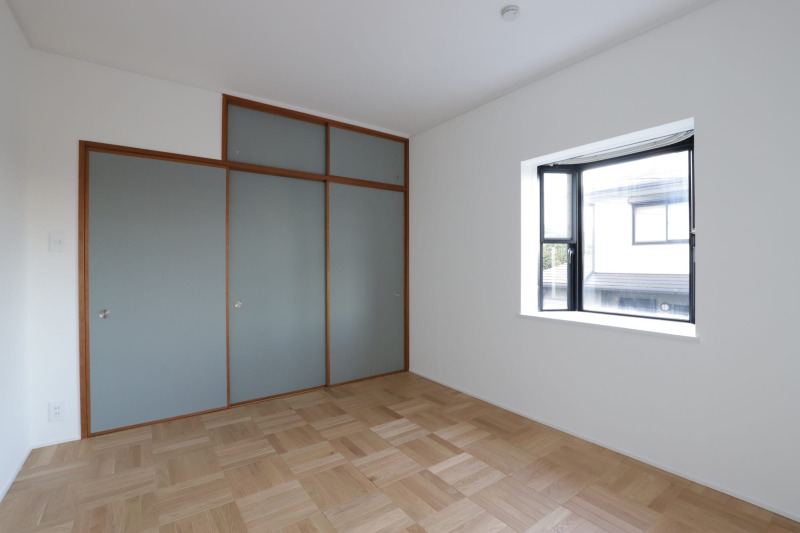 元和室の個室。スクールパーケットと木枠にくすんだ青の引戸の組み合わせがモダンな印象になりました。