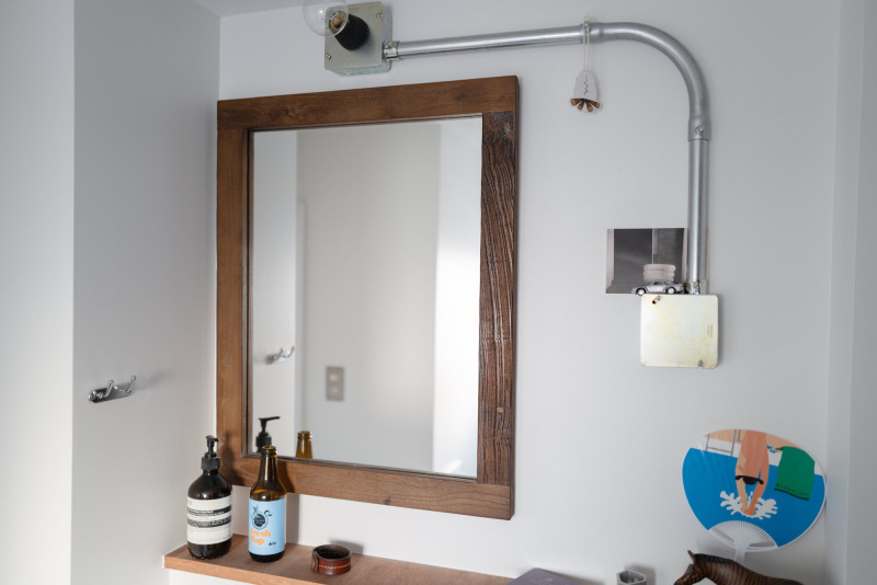 白の塗装壁の中に、古材の洗面ミラーを合わせて。