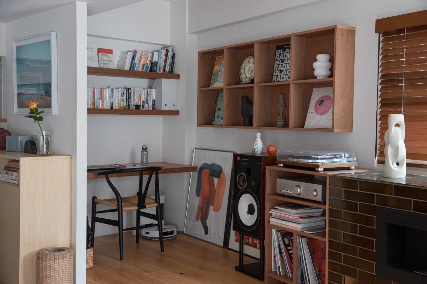リビングの一角にあるワークスペース。背面の棚は、レコードを飾ることを想定したサイズで造作。