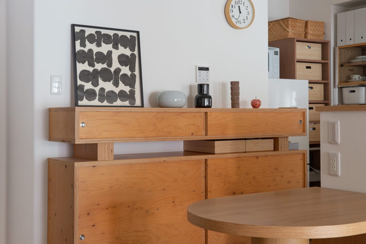 以前の住まいから使っていた造作のカップボード。真ん中に隙間があるデザインで圧迫感を無くしています。