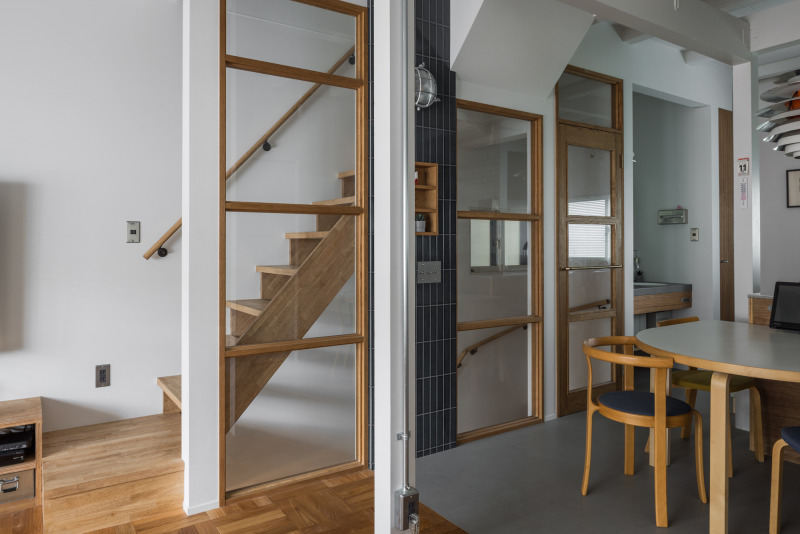 階段まわりはガラスとスケルトン階段で軽やかに。家族の気配が伝わる、抜けのあるデザインです。