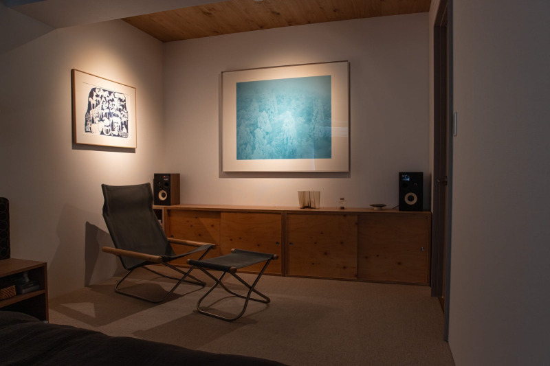 壁面の大きなアートをスポットライトで温かく照らす灯りの演出。