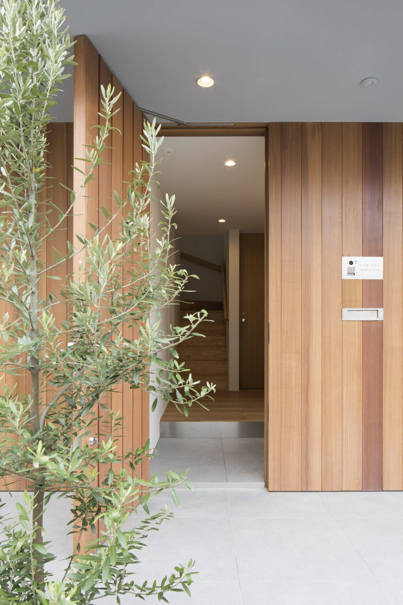玄関ドアは、外壁のレッドシダー縁甲板と一体的なつくりに。