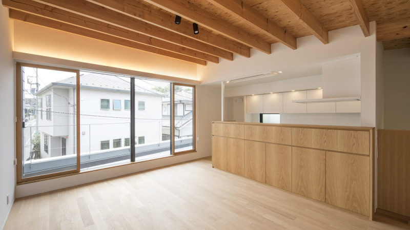 2階にあるリビングダイニング。造作のキッチン収納でキッチン部分は隠してすっきりと。