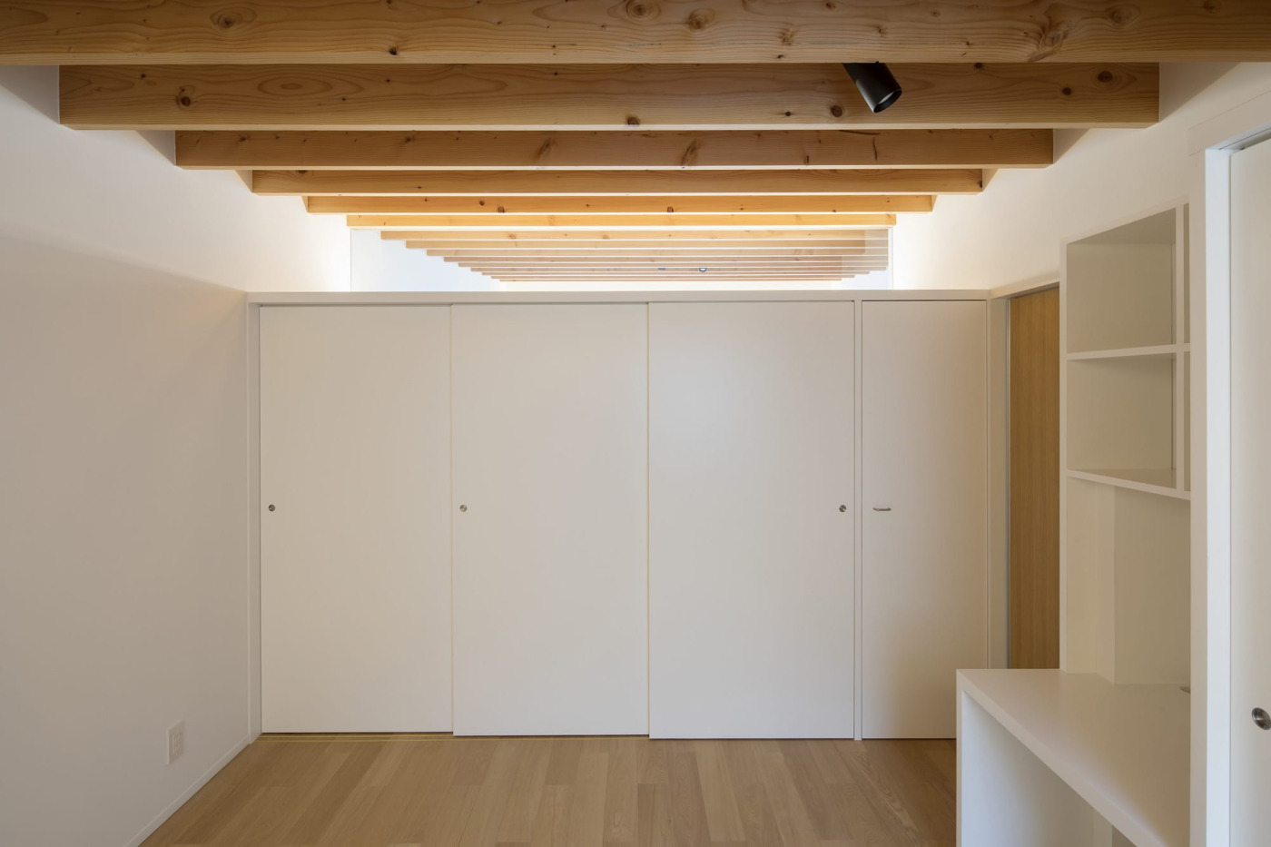 リビング横の寝室スペース。造作棚は白で統一。木の天井が開放的につながって圧迫感なし。