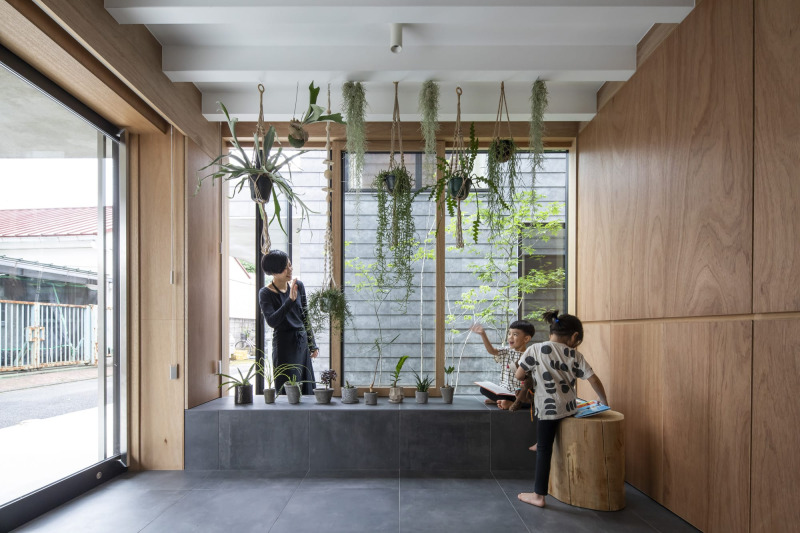 1階の庭ごしには、屋内にもグリーンをハンギング。木製網戸の木枠がアクセントに。