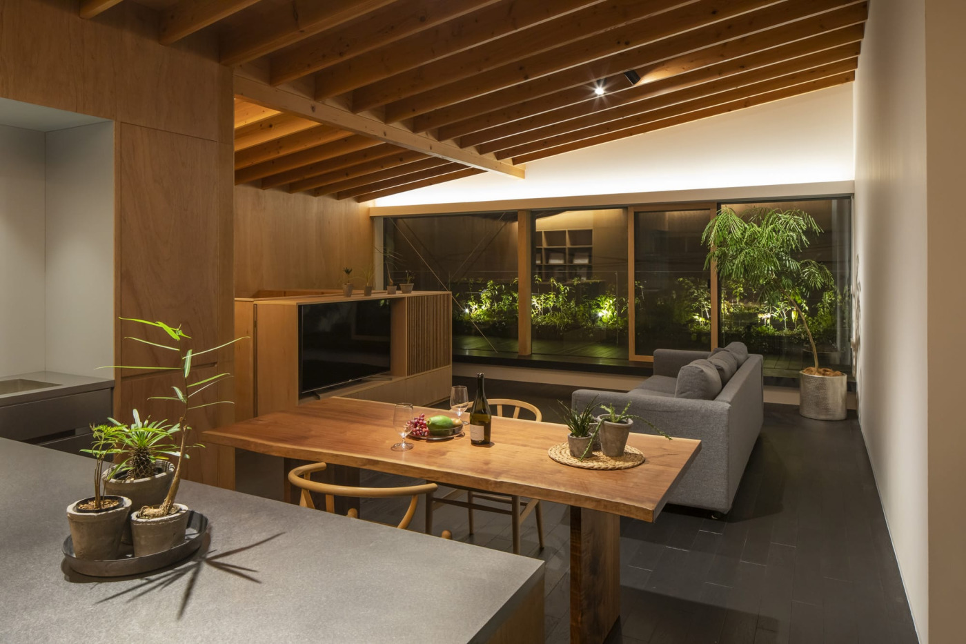 2階がメインのリビングダイニング。片流れ屋根の開放的な空間。
