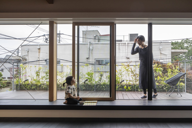 開放的な連続窓には、「木製網戸」を室内側に設けて、木フレームのアクセントに。