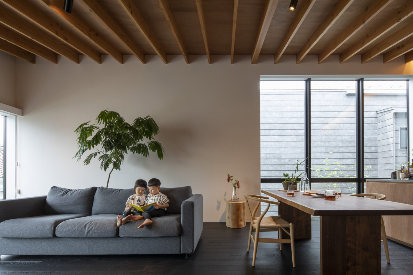 黒く締めた床に、無垢のテーブルや天井の化粧梁が映えます。