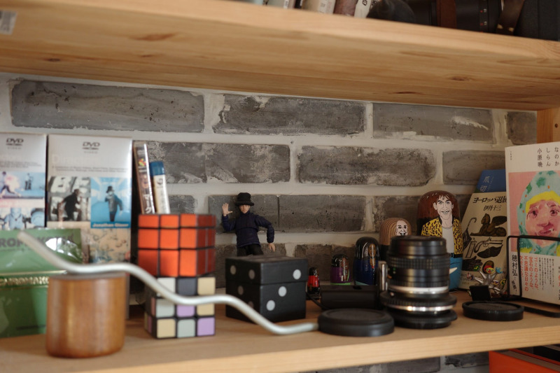 背板のない本棚は、壁材がそのまま飾るものの背景に。白い壁よりも飾るものの素材感を引き立ててくれる。