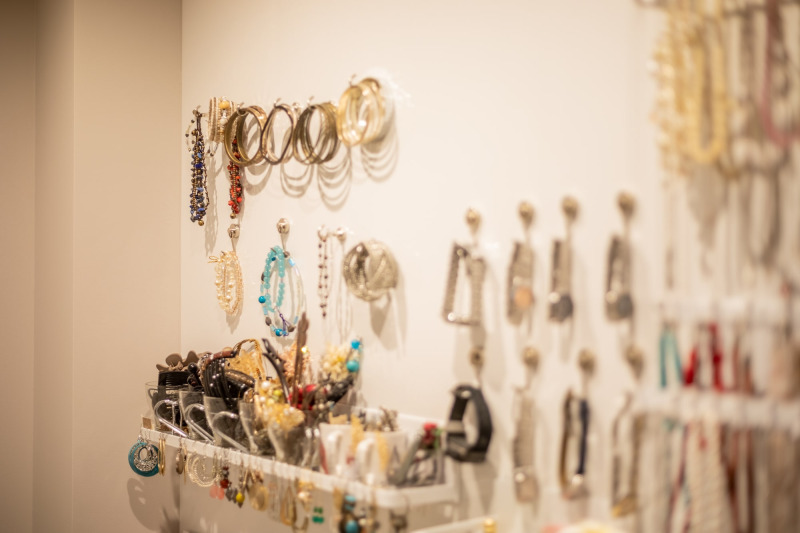 こちらは洗面所の一角。壁一面をマグネットウォールにして、マグネット収納パーツを使ってアクセサリーコーナーにしています。