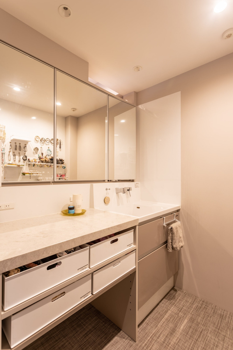 大きな3面鏡と作業カウンターを備えた洗面所。背面の壁はマグネットウォールになっていて、マグネット収納パーツを使ってアクセサリーコーナーにしています。