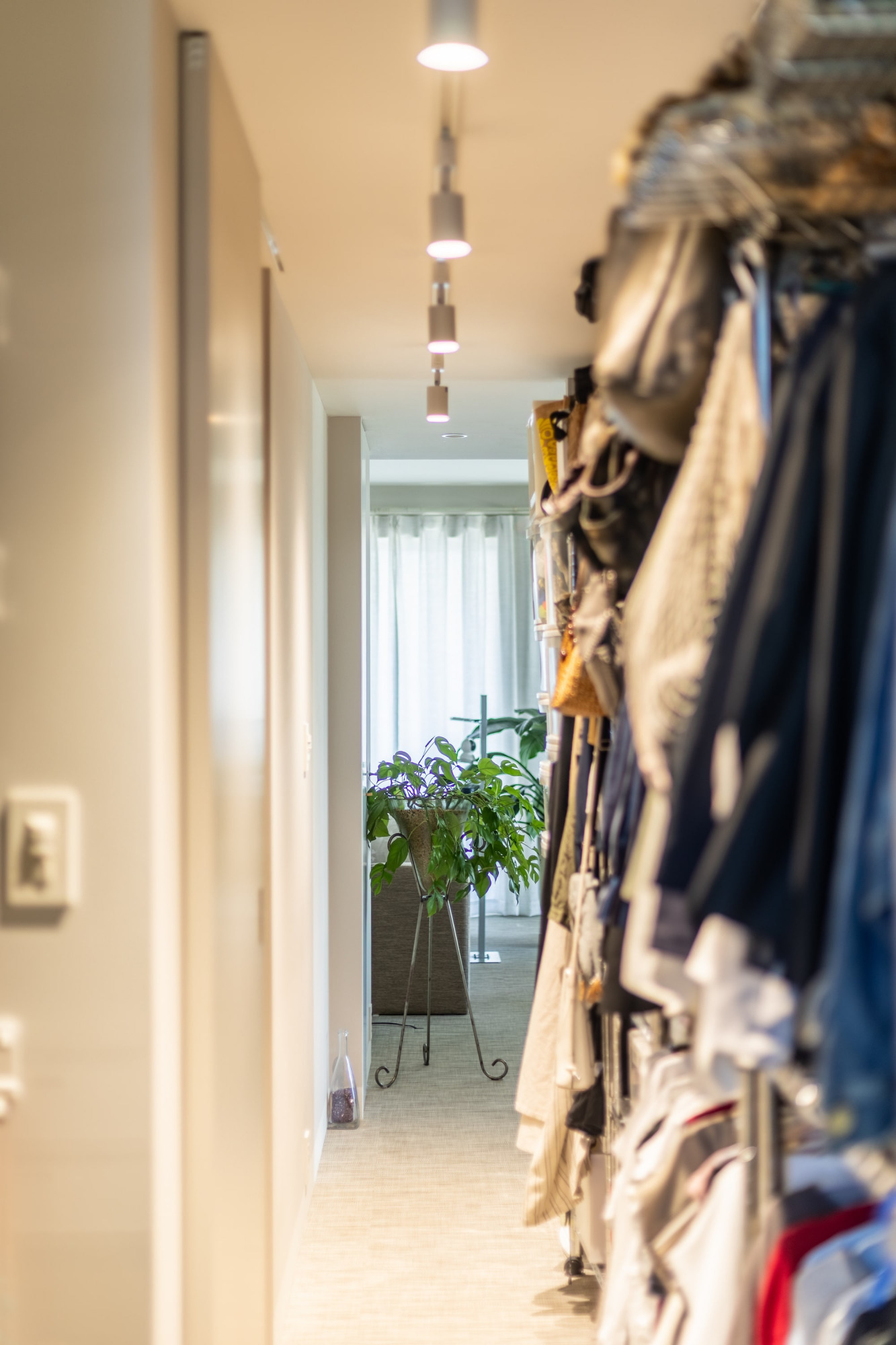 玄関とリビングを繋ぐ通路も兼ねる、ウォークスルークローゼット。ハンガーラックの対面には、洗面所とランドリールームを兼ねた脱衣所があり、着替え・身支度・洗濯がここで完結。