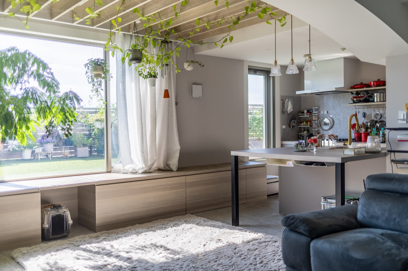 窓際に設けたステップ兼収納は、広々としたルーフバルコニーと空の眺めを楽しめる特等席。一部はキャスター付きで引き出すことができ、ダイニングスツールとして使えます。