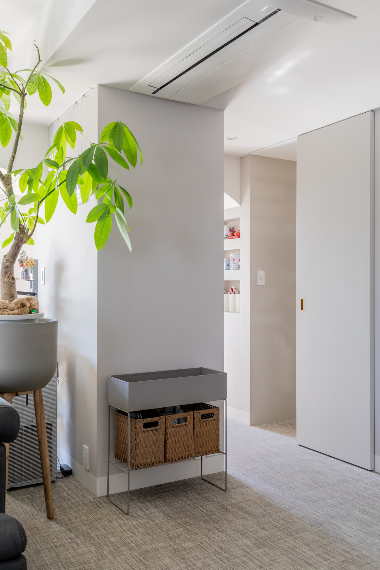 30帖以上ある広いLDK+寝室を効率的に空調するために、エアコンはすっきりデザインの天井埋め込みカセット式を採用。