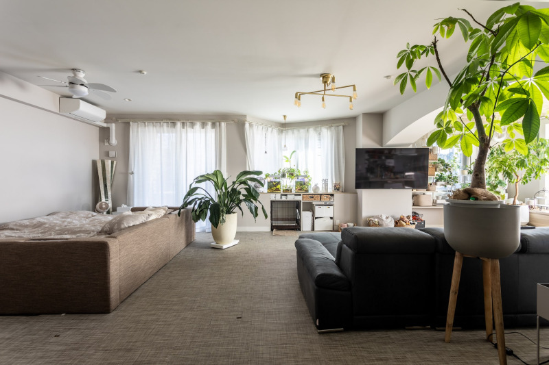 「広々とした空間が好き」「個室は要らない」と、リビングにダブルベッドを2つ置き、寝室一体の空間に。ヘッドボードがファブリック仕上げのベッドを選んで、ソファと同調させています。