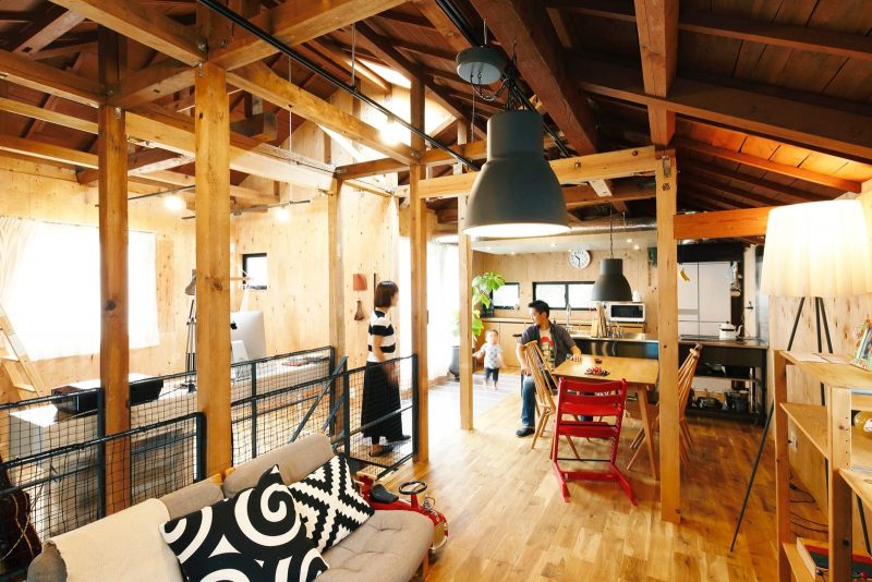 柱や梁も向きだしの構造体現しのスケルトン戸建てのリビング。