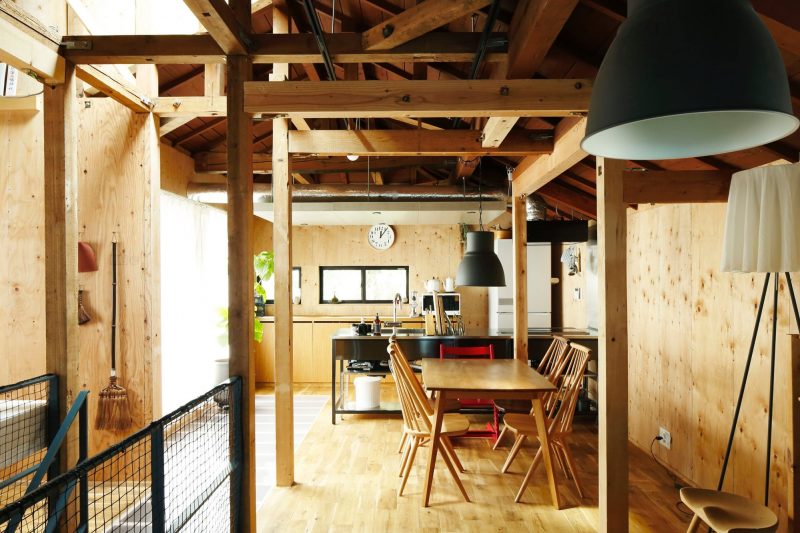 柱や梁も向きだしの構造体現しのスケルトン戸建てのリビング。キッチンからひとつながり。