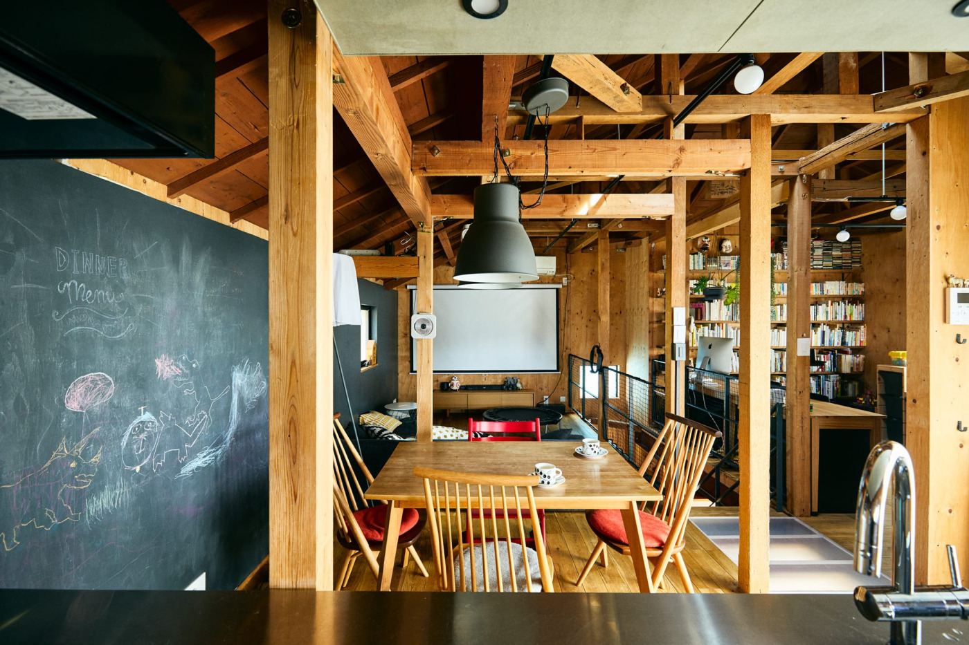 森のように木の柱が乱立する木造スケルトンのリビング。壁一面は住んだあとに黒板塗料でDIY。