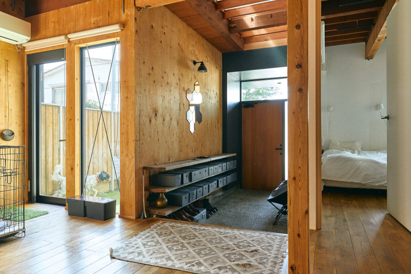 玄関から広がる多目的スペース。ウッドフェンスの庭では、愛犬が自由に遊び回れる。