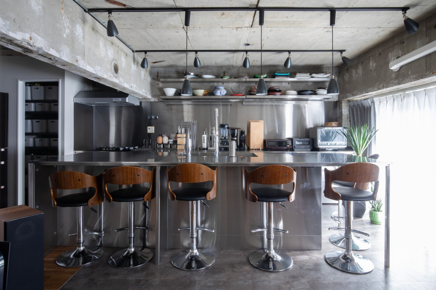 3.3mのキッチンカウンターがお出迎え。キッチンは、オールステンレスで造作した。