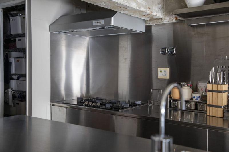 造作のステンレスキッチン本体と合わせて壁のステンレスで統一。思い切り料理をした後、掃除もしやすい。