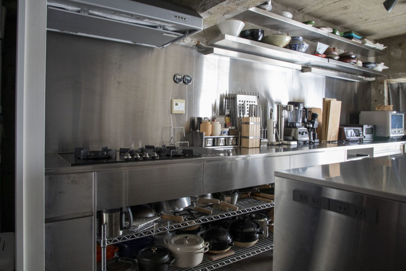 愛用の重い鍋類は、コンロ下のオープンシェルフに収納。可動式で手前に引きだせる。