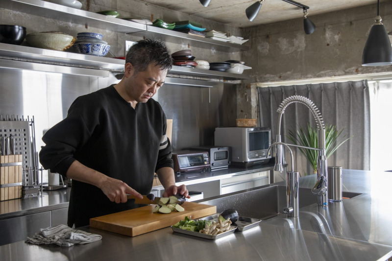中央のアイランドのシンク横が、メインの作業スペース。ゲストを招いた時は、お店のオープンキッチンのように、目の前で下準備から盛り付けまで行う。