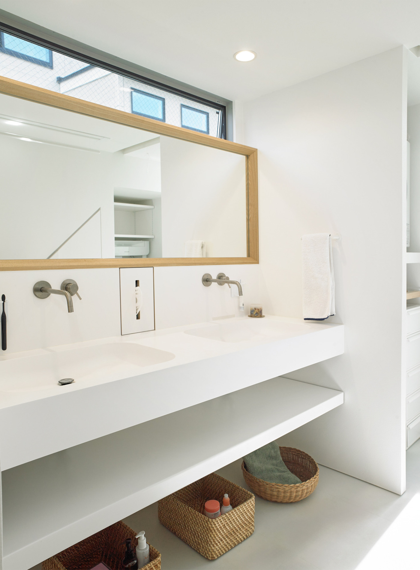 ボウルと水栓が2つずつ並んだ、白を基調とした洗面。洗面台は白で2ボウル、かつシームレスなものがいいと決めていたそうで『人工大理石の洗面カウンター』を特注で注文。サイズオーダー可能な商品のため壁との間にぴったりとはまっています。