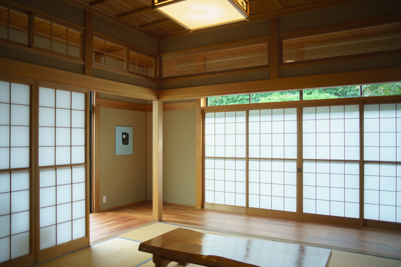 L字に設けられた縁側と庭が印象的な客室。床の間や組子細工の建具など、もとの民家の佇まいを活かしながら、シンプルに整えています。