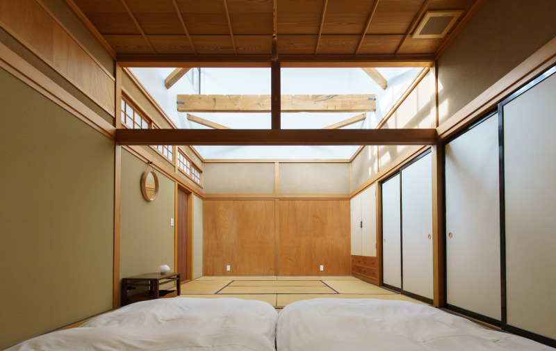 もう一つの客室は二階の一部を解体して部屋の半分を大胆に吹き抜けに。見上げる窓からは空が見えて、屋内にいながら外とつながるような、不思議な開放感を味わえます。