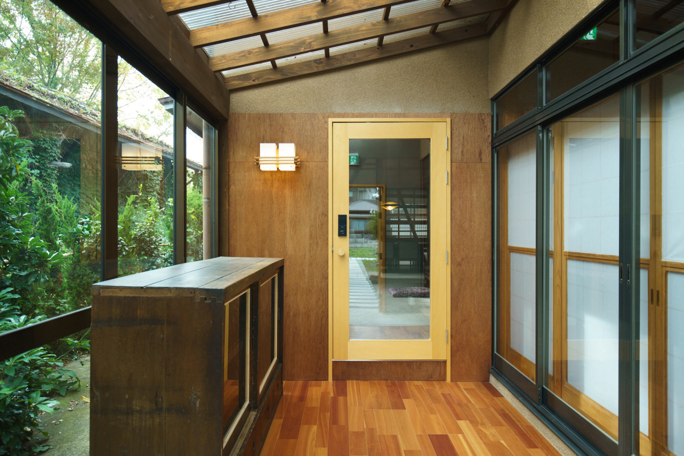 冷たい外気をいったん受け止める、寒い地域ならではの二重扉。建物に入る前の、小さな緩衝地帯。