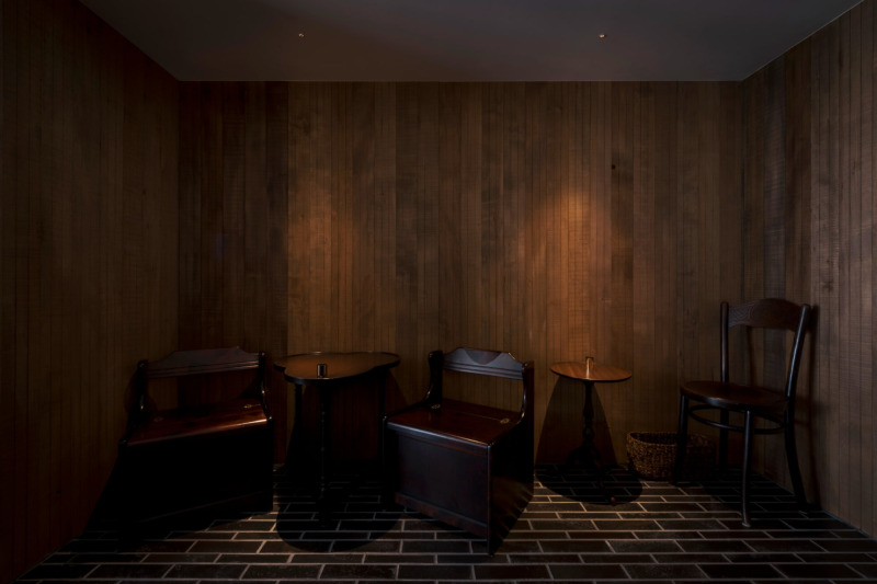 炭色のタイル床と、幅の細い板貼り壁が、落ち着いた居心地をつくっています。照らす範囲を絞った照明が、板壁やタイルの質感を際立たせます。