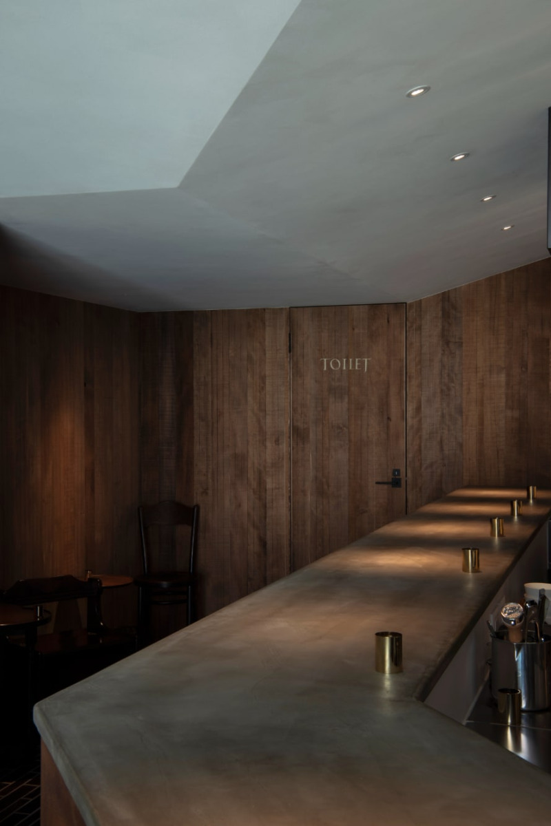 開放感とこもり感を生み出す、斜め天井。あえて塗りムラを感じる表情にすることで、天井に存在感を持たせつつ、頭上の圧迫感を和らげています。