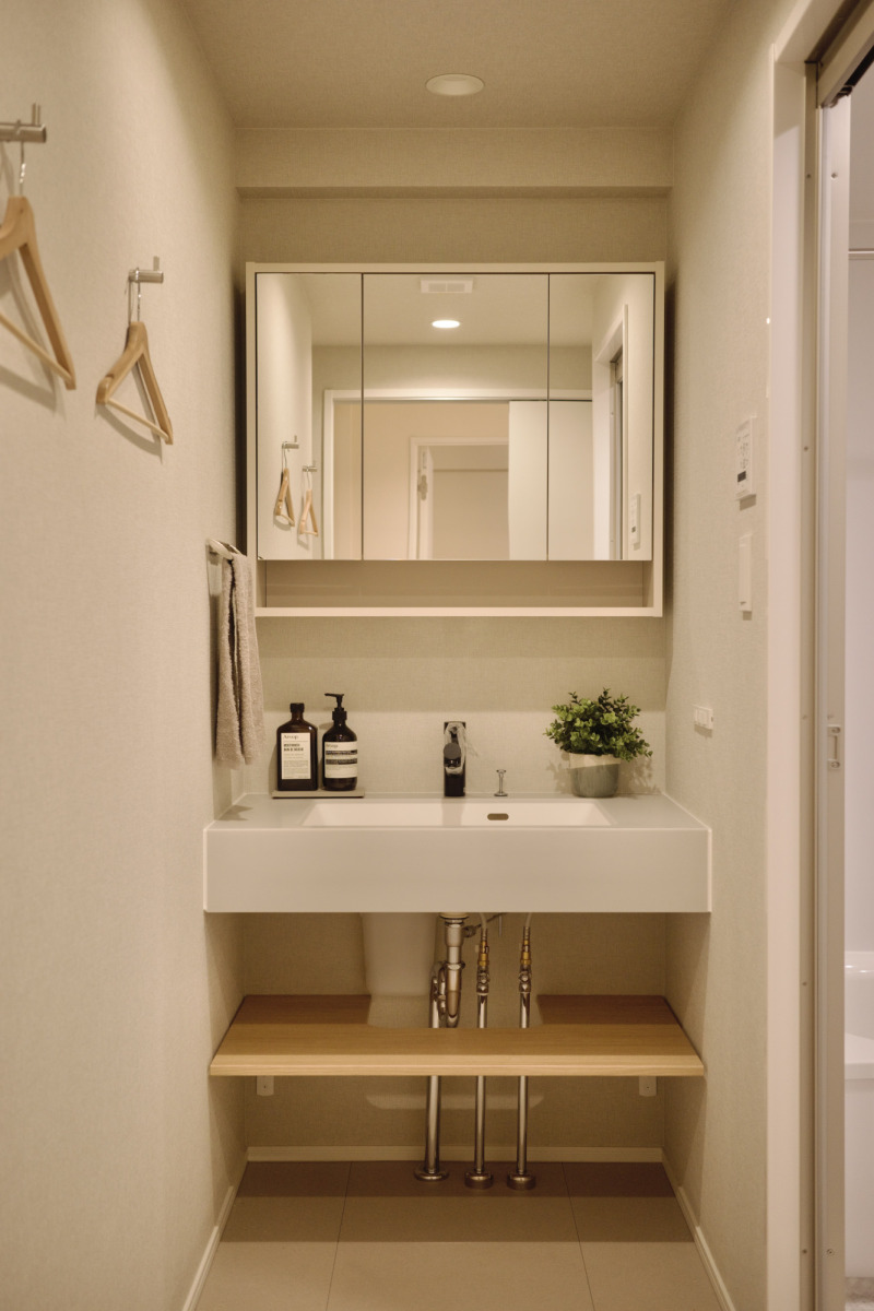 オープンと隠す収納をバランスよく配置し、壁にはハンガーを掛けられるフックを。機能的であたたかみを感じる洗面空間。