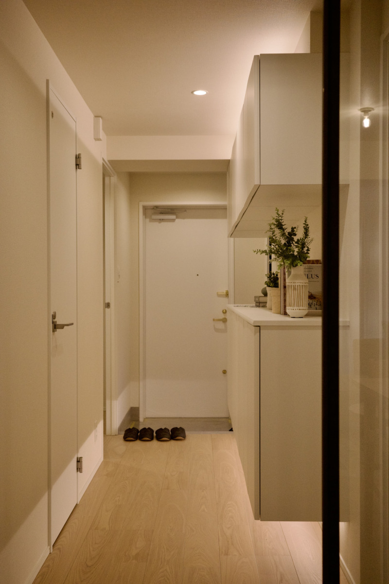 壁と同系色でなじませたフロートの玄関収納。足元に抜けが生まれ、玄関に軽やかな広がりが生まれています。