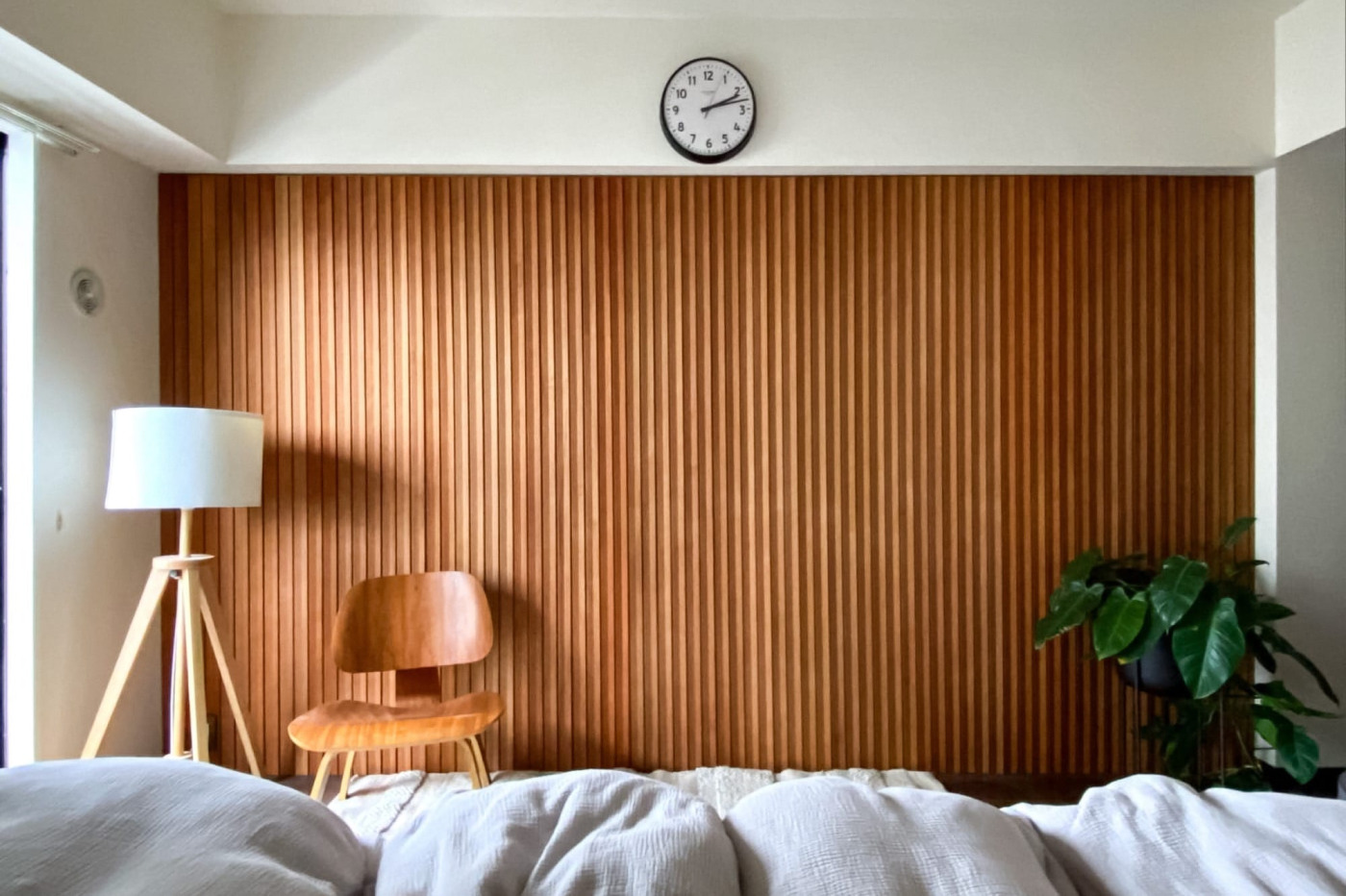「壁貼りサービス」で寝室の壁を壊さずアップデート。ゆっくり読書をしたくなるような居心地が生まれました。