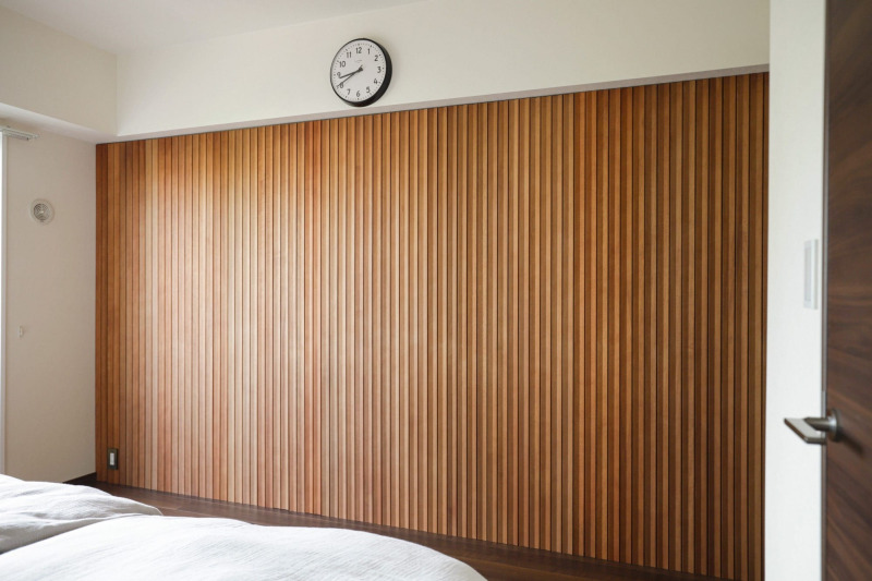 ベッドの目の前の壁に『クラシックリブパネル』。朝と夜、時間帯によって移り変わる光の表情を堪能。