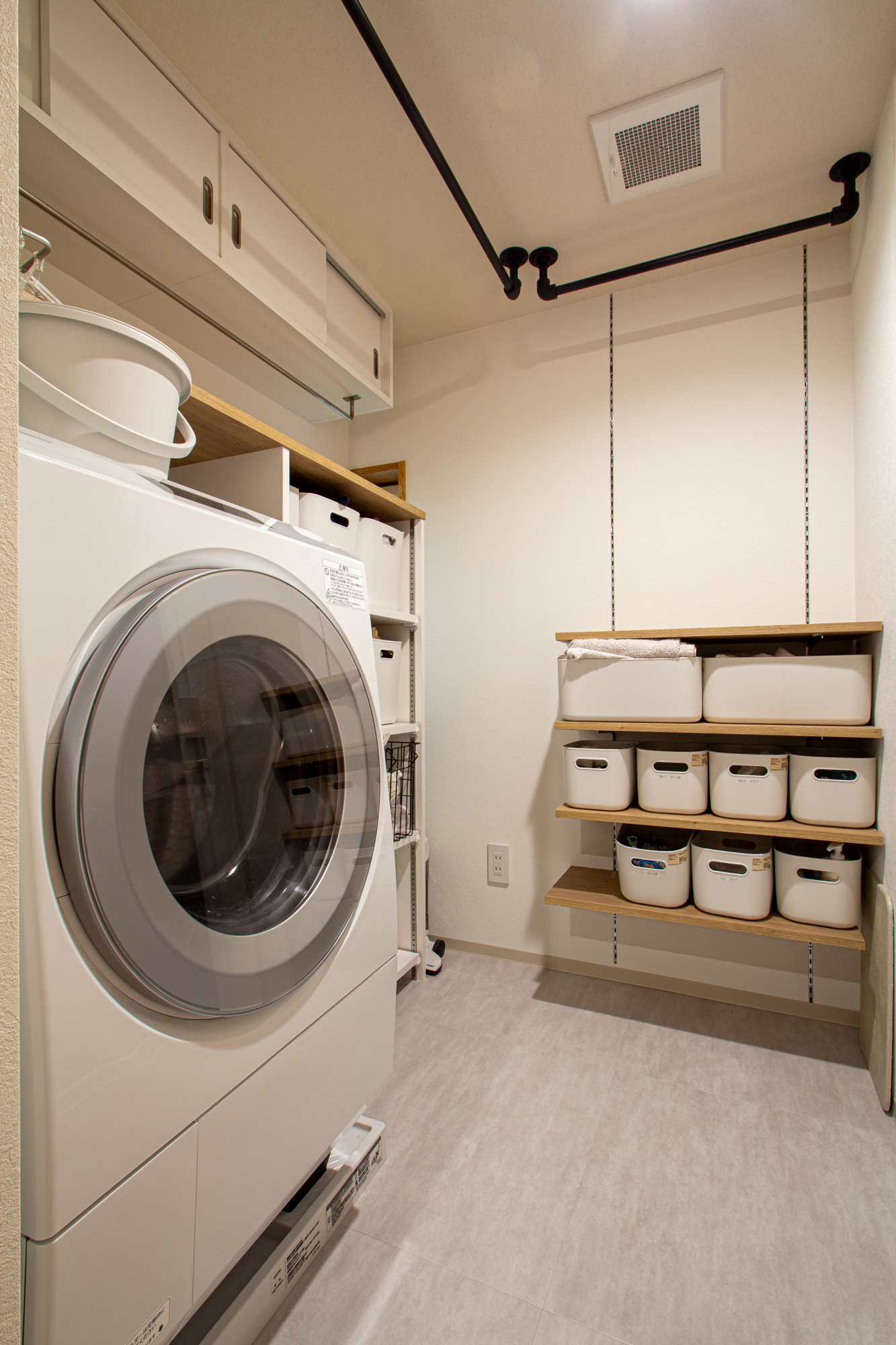 『アイアンハンガーパイプ』を設け、洗う・干す・しまうがひと続きに。毎日の家事が気持ちよく回る、脱衣スペース。