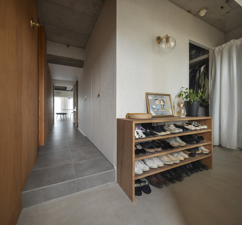 玄関を入ると、タイル床の廊下がまっすぐに伸びていきます。白い壁面に収まった収納扉に、『木のつまみ』を採用いただきました。