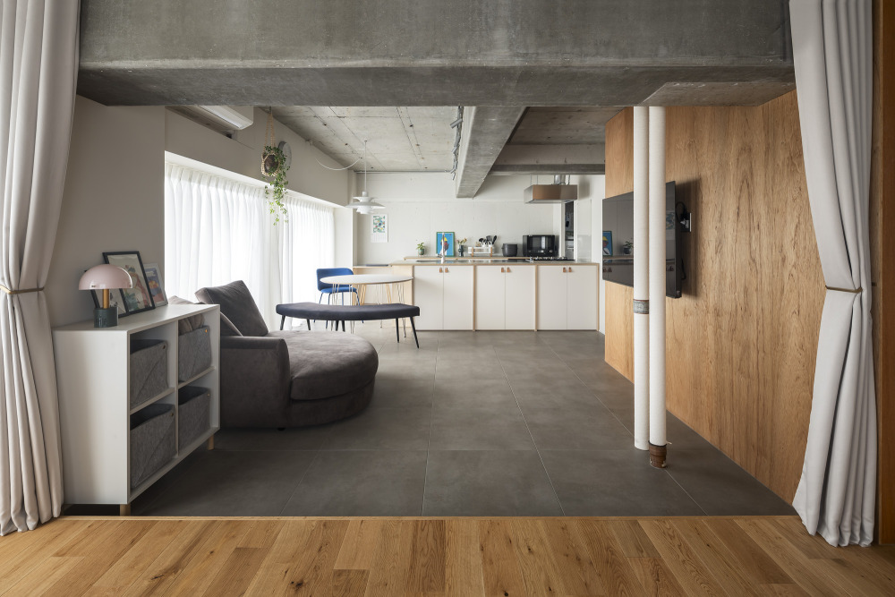 リビングは大きな窓からたっぷりと光が入り、キッチン、リビング、フリースペースまで見通しの良いつくり。