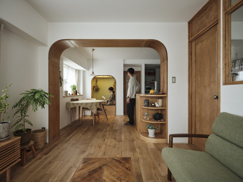 印象的な木製のアールの開口部は、実は存在感のある梁を隠しながら空間に馴染ませたもので、大きなアールとリンクするようにヌックの開口部にも小さなアールを施すことで、空間全体にやさしい統一感を生み出しています。