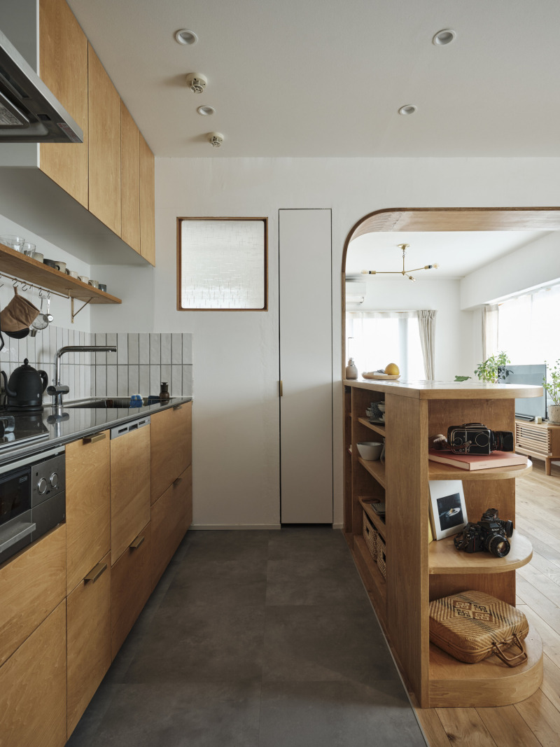 システムキッチンをベースに、扉面材をシナ材へ変更し、既製品のキッチンをオリジナル仕様へとリメイク。『棚受け金物』や小物掛け用の『ハンガーバー』には柔らかな木にの表情に合わせて、真鍮素材を採用。