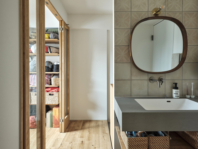 廊下にオープンな洗面を配置することで、玄関から自然につながる動線を確保しています。