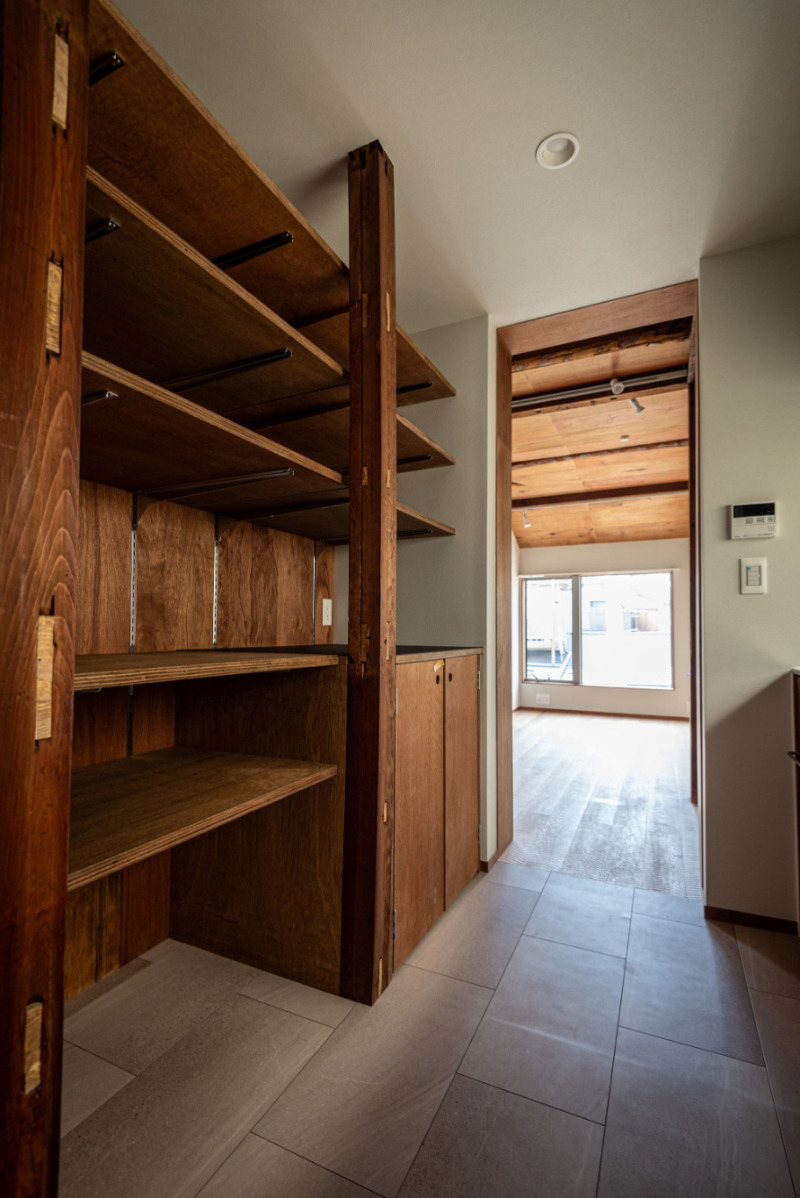 構造体である柱をうまく一体化させたキッチン収納。柱に合わせてラワンをオイル塗装して、新旧を馴染ませています。
